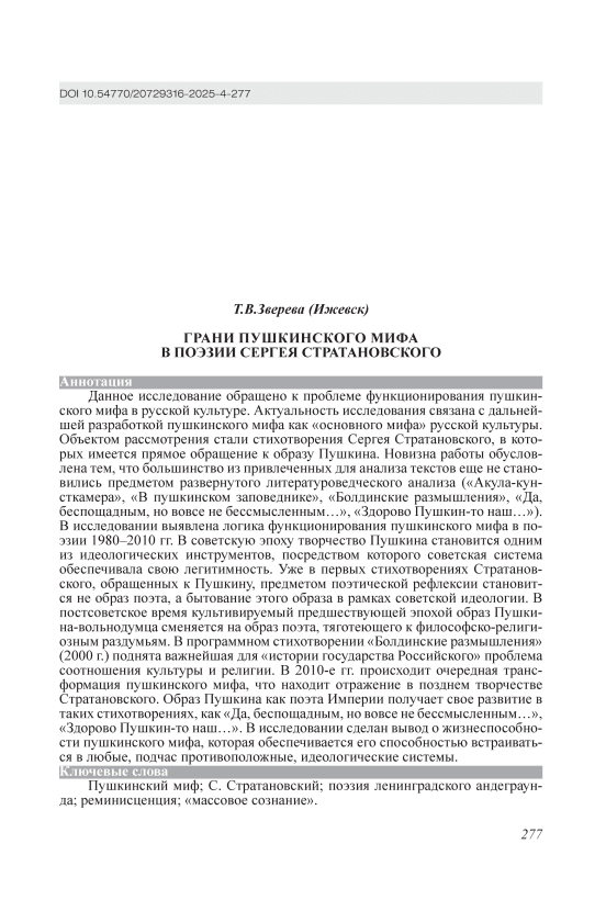 Данное исследование обращено к проблеме функционирования пушкинского мифа в русской культуре. Актуальность исследования связана с дальнейшей разработкой пушкинского мифа как «основного мифа» русской культуры. Объектом рассмотрения стали стихотворения Сергея Стратановского, в которых имеется прямое обращение к образу Пушкина. Новизна работы обусловлена тем, что большинство из привлеченных для анализа текстов еще не становились предметом развернутого литературоведческого анализа («Акула-кунсткамера», «В пушкинском заповеднике», «Болдинские размышления», «Да, беспощадным, но вовсе не бессмысленным…», «Здорово Пушкин-то наш…»). В исследовании выявлена логика функционирования пушкинского мифа в поэзии 1980–2010 гг. В советскую эпоху творчество Пушкина становится одним из идеологических инструментов, посредством которого советская система обеспечивала свою легитимность. Уже в первых стихотворениях Стратановского, обращенных к Пушкину, предметом поэтической рефлексии становится не образ поэта, а бытование этого образа в рамках советской идеологии. В постсоветское время культивируемый предшествующей эпохой образ Пушкина-вольнодумца сменяется на образ поэта, тяготеющего к философско-религиозным раздумьям. В программном стихотворении «Болдинские размышления» (2000 г.) поднята важнейшая для «истории государства Российского» проблема соотношения культуры и религии. В 2010-е гг. происходит очередная трансформация пушкинского мифа, что находит отражение в позднем творчестве Стратановского. Образ Пушкина как поэта Империи получает свое развитие в таких стихотворениях, как «Да, беспощадным, но вовсе не бессмысленным…», «Здорово Пушкин-то наш…». В исследовании сделан вывод о жизнеспособности пушкинского мифа, которая обеспечивается его способностью встраиваться в любые, подчас противоположные, идеологические системы.