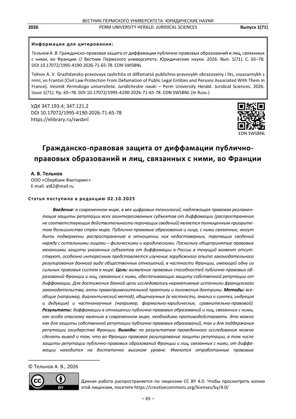 Introduction: in today's world, in the age of digital technologies, one of the top priorities in most countries around the world is proper legal regulation of the protection from defamation of the reputation of those affected. Clearly, public legal entities and individuals associated with them can be affected by defamation (i.e., dissemination of false and defamatory information) along with other legal entities and private persons. Since in Russia there are currently no generally accepted legal mechanisms for protecting public legal entities and associated individuals from defamation, it is particularly interesting to study for-eign experience in legislative regulation of this type of social relations, including the experience of France, which has one of the strongest legal systems in the world. Purpose: the study aims to identify the legal capabilities of French public legal entities and individuals associated with them to protect their reputation from defamation. To this end, the author has examined the sources of French legislation, acts of law en-forcement, and the provisions of the doctrine. Methods: the study applied universal methods (such as the dialectical method), general scientific methods (including analysis and synthesis, induction and deduction), and specific scientific methods (including formal legal and comparative legal methods). Results: Defama-tion against public legal entities and individuals associated with them is a particularly dangerous phenom-enon in today's world, and it must be countered. This is necessary both to protect the reputation of public legal entities themselves and to maintain the reputation of the French state. Conclusions: in France, the legal regulation of reputation protection, including the protection of the reputation of French public legal entities and associated individuals from defamation, is provided at a fairly high level. There are well-es-tablished legal mechanisms that can be used to ensure this protection. The protection of the reputation of such entities and individuals from defamation directly affects the reputation of the French state as a whole.