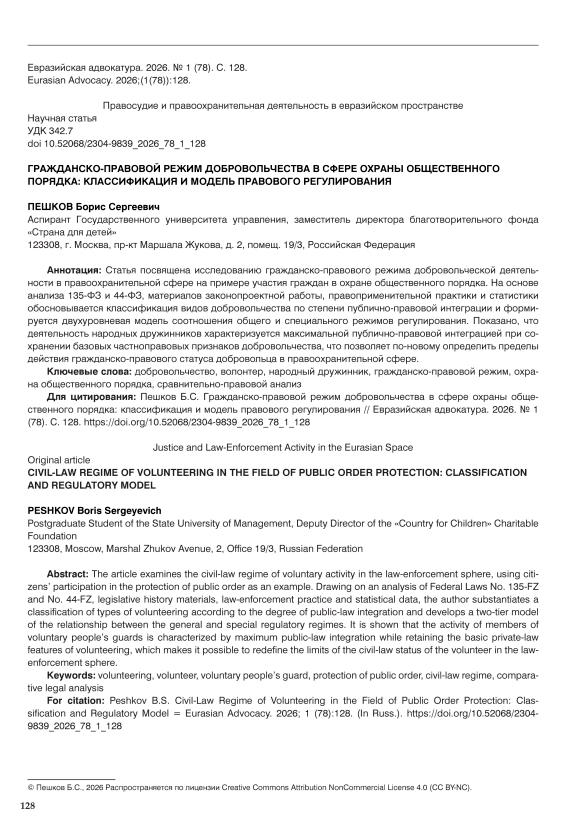 The article examines the civil-law regime of voluntary activity in the law-enforcement sphere, using citizens’ participation in the protection of public order as an example. Drawing on an analysis of Federal Laws No. 135‑FZ and No. 44‑FZ, legislative history materials, law-enforcement practice and statistical data, the author substantiates a classification of types of volunteering according to the degree of public-law integration and develops a two-tier model of the relationship between the general and special regulatory regimes. It is shown that the activity of members of voluntary people’s guards is characterized by maximum public-law integration while retaining the basic private-law features of volunteering, which makes it possible to redefine the limits of the civil-law status of the volunteer in the lawenforcement sphere.