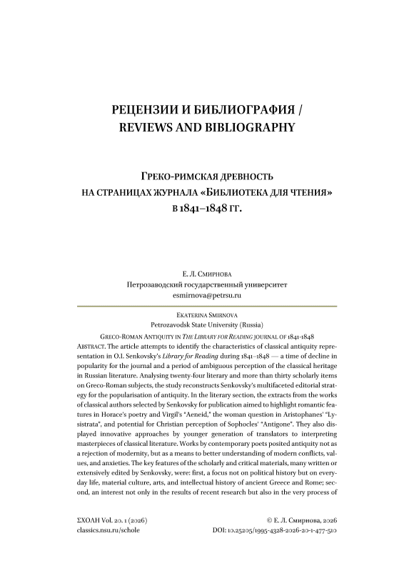 В статье предпринята попытка выявить особенности представления классической античности в «Читальной библиотеке» О.И. Сенковского в 1841–1848 годах — в период упадка популярности журнала и неоднозначного восприятия классического наследия в русской литературе. Анализируя двадцать четыре литературных и более тридцати научных статей на греко-римскую тематику, исследование реконструирует многогранную издательскую стратегию Сенковского по популяризации античности. В литературном разделе отрывки из произведений классических авторов, отобранные Сенковским для публикации, были призваны подчеркнуть романтические черты в поэзии Горация и «Энеиде» Вергилия, женский вопрос в «Лисистрате» Аристофана и потенциал христианского восприятия «Антигоны» Софокла. Они также демонстрировали новаторские подходы молодого поколения переводчиков к интерпретации шедевров классической литературы. В произведениях современных поэтов античность рассматривалась не как отказ от современности, а как средство для лучшего понимания современных конфликтов, ценностей и тревог. Ключевыми особенностями научных и критических материалов, многие из которых были написаны или существенно отредактированы Сенковским, были: во-первых, сосредоточение внимания не на политической истории, а на повседневной жизни, материальной культуре, искусстве и интеллектуальной истории Древней Греции и Рима; во-вторых, интерес не только к результатам недавних исследований, но и к самому процессу создания новых знаний о классическом мире; и, наконец, намеренно ясный, увлекательный, ориентированный на широкую публику стиль. Таким образом, античность представлялась как привлекательная цивилизация с уникальным культурно-историческим опытом, тайны которой еще ждут исследователей, и как неисчерпаемый источник творческого диалога между эпохами. Эта модель позволила Сенковскому обращаться как к широкой читательской аудитории, тем самым выполняя образовательную миссию журнала, так и к ученой элите, приглашая ее к размышлениям о методологии античной истории, переводе с классических языков и эффективных способах представления общественности специализированных вопросов классической филологии и археологии.