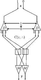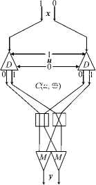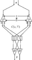 A photonic 1 x 2 demultiplexer D and a photonic 2 x 1 multiplexer M are used in Figure 1 . They are assembled from several thin-film layers of metamaterials with electro-optical or magneto-optical properties [6 , 7] . A peculiarity of these elements is that an optical signal is used to control switching. In the demultiplexer, they are converted into two control signals