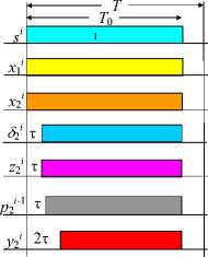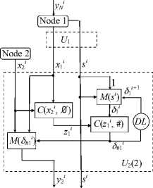 The initial first node of the network does not use its unit U 1 (1). It outputs slot X 1 , containing a binary multi-bit number starting from the least significant bits (on the two- rail value line), and slot S of the same bit length (on the two-rail synchronization line). In slot X 1 , the bits are transmitted by the variables x i 1 ; in slot S , by the variables s i , where i denotes the bit number. The first bit of slot S has value s 1 = 1 and the other bits s i = 0 for i > 1. The dots on the lines indicate the nodes of light signal separation by branching optical lines. The unit U 2 (1) of the distributed adder is connected to the first and second network nodes.