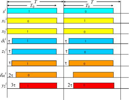 To execute CCC operations, logical variables are transmitted via the channel in the two-rail form (along two lines, 0 and 1). Value 0 is transmitted by a signal in line 0 in the absence of a signal in line 1, and value 1 is transmitted by a signal in line 1 in the absence of a signal in line 0. Lines 0 and 1 pass through the converter C i of each network node i. Each converter executes the unary operation O i of transforming an input logical variable x i to an output logical variable y i = O i x i .