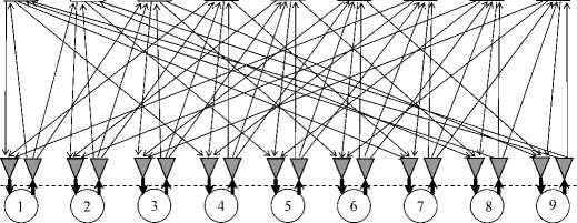 The connections in the switch S i+ 1 (N i + 1 ,m) are constructed as follows. According to the source and sink numbers given, the switch S i (N i ,m) with both numbers (from the source and to the sink) is searched in the incidence table. The connection between the users is routed through the selected switch. For example, in Table 5 , source 2 and sink 23 are connected through the switch with number 2.