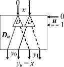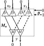 Table 1 provides the truth tables of the logical operations used in the circuits in Figure 1. Obviously, the operation ℵ is defined only by the pair of states of the converter C i , which are selected by the value of the variable u i . As a result, it is possible to execute the binary operation y i = x i ℵ u i (any of the sixteen logical operations) on a pair of the converters. Figure 2 also shows the circuits of a multiplexer (M u ) and demultiplexer (D u ) controlled by the variable u for two-rail variables.