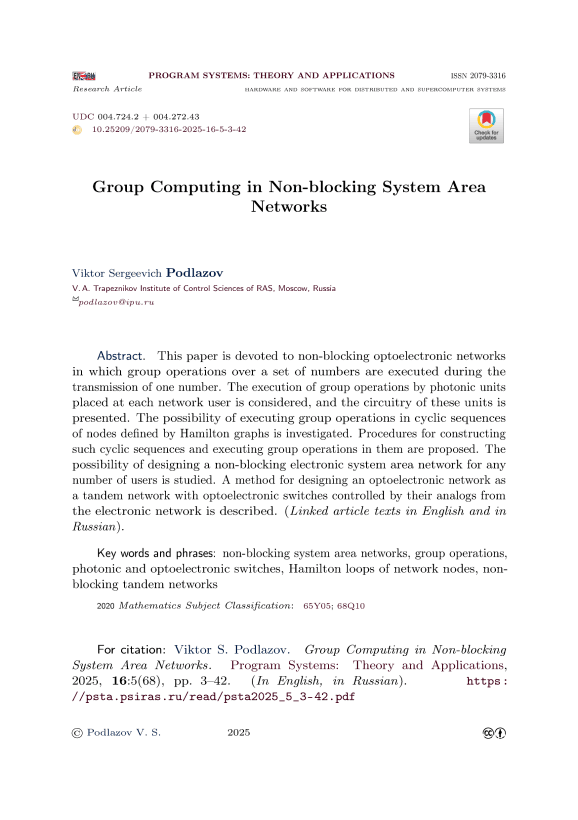 Рассмотрены неблокируемые оптоэлектронные сети, в которых выполняются групповые операции над множеством чисел за время передачи одного числа. Рассмотрено выполнение групповых операций исполнительными фотонными блоками, размещенными при каждом абоненте сети, и представлена схемотехника этих блоков. Исследована возможность выполнения групповых операции в циклических последовательностях узлов, задаваемых гамильтоновыми графами. Предложены процедуры построения этих циклических последовательностей и выполнения в них групповых операций. Рассмотрена возможность построения неблокируемой электронной системной сети на любое число абонентов. Предложен способ построения оптоэлектронной сети как тандемной сети, в которой оптоэлектронные переключатели управляются их аналогами из электронной сети.