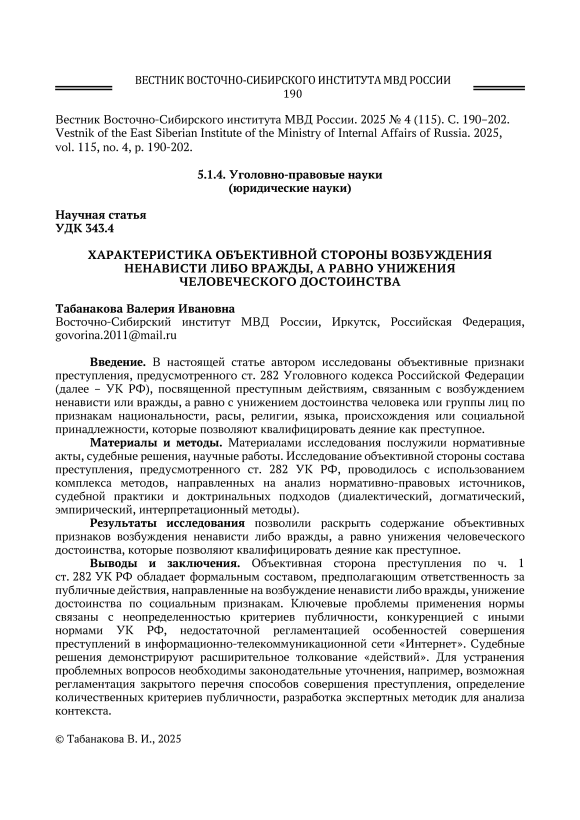 В настоящей статье автором исследованы объективные признаки преступле-ния, предусмотренного ст. 282 Уголовного кодекса Российской Федерации, посвященной преступным действиям, связанным с возбуждением ненависти или вражды, а равно с унижением достоинства человека или группы лиц по признакам национальности, расы, религии, языка, происхождения или соци-альной принадлежности, которые позволяют квалифицировать деяние как преступное. Материалами исследования послужили нормативные акты, су-дебные решения, научные работы. Исследование объективной стороны соста-ва преступления, предусмотренного ст. 282 УК РФ, проводилось с использо-ванием комплекса методов, направленных на анализ нормативно-правовых источников, судебной практики и доктринальных подходов (диалектический, догматический, эмпирический, интерпретационный методы). Результаты исследования позволили раскрыть содержание объективных при-знаков возбуждения ненависти либо вражды, а равно унижения человеческого достоинства, которые позволяют квалифицировать деяние как преступное. Объективная сторона преступления по ч. 1 ст. 282 УК РФ обладает формаль-ным составом, предполагающим ответственность за публичные действия, направленные на возбуждение ненависти либо вражды, унижение достоинства по социальным признакам. Ключевые проблемы применения нормы связаны с неопределённостью критериев публичности, сложностью разграничения со ст. 280 УК РФ. Судебные решения демонстрируют расширительное толкование «действий». Для устранения проблемных вопросов необходимы законода-тельные уточнения, например, возможная регламентация закрытого перечень способов совершения преступления, определение количественных критерии публичности, разработка экспертных методик для анализа контекста.