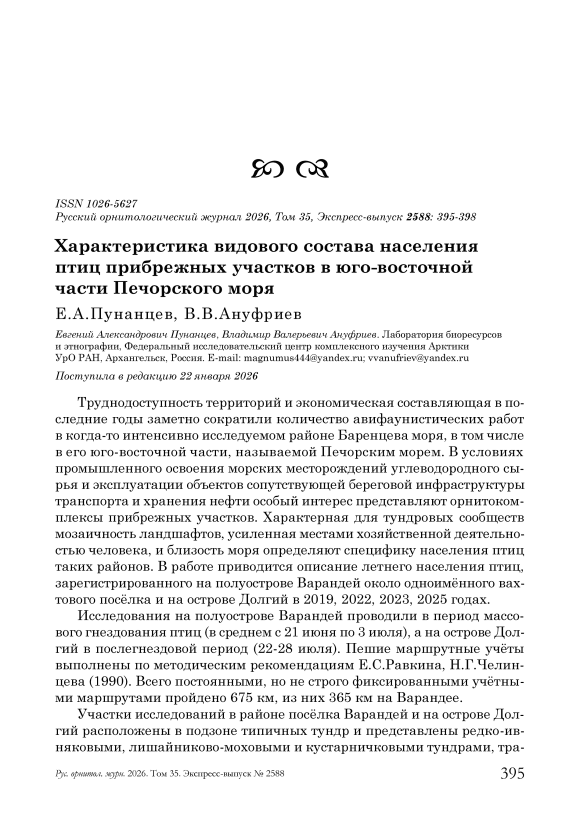Труднодоступность территорий и экономическая составляющая в последние годы заметно сократили количество авифаунистических работ в когда-то интенсивно исследуемом районе Баренцева моря, в том числе в его юго-восточной части, называемой Печорским морем. В условиях промышленного освоения морских месторождений углеводородного сырья и эксплуатации объектов сопутствующей береговой инфраструктуры транспорта и хранения нефти особый интерес представляют орнитоком-плексы прибрежных участков. Характерная для тундровых сообществ мозаичность ландшафтов, усиленная местами хозяйственной деятельностью человека, и близость моря определяют специфику населения птиц таких районов. В работе приводится описание летнего населения птиц, зарегистрированного на полуострове Варандей около одноимённого вахтового посёлка и на острове Долгий в 2019, 2022, 2023, 2025 годах.