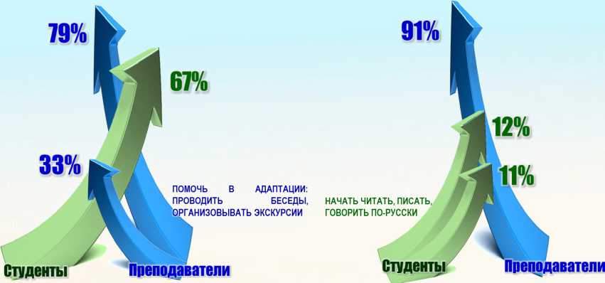 Материал исследования показал, что многие преподаватели цель первых занятий по РКИ видят, прежде всего, в необходимости формирования требуемых компетенций (91%). Помочь в адапта- ции иностранным слушателям готовы 79% преподавателей. Значительно меньше информантов, 33%, считают важным «мотивировать к изучению языка, сплотить группу, научить учиться и испытывать от этого процесса радость».