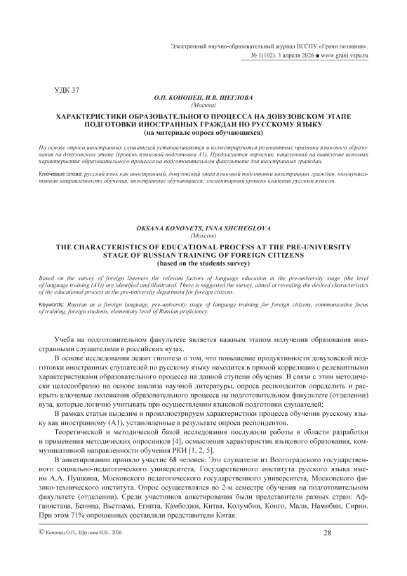 На основе опроса иностранных слушателей устанавливаются и иллюстрируются релевантные признаки языкового образования на довузовском этапе (уровень языковой подготовки А1). Предлагается опросник, нацеленный на выявление искомых характеристик образовательного процесса на подготовительном факультете для иностранных граждан.
