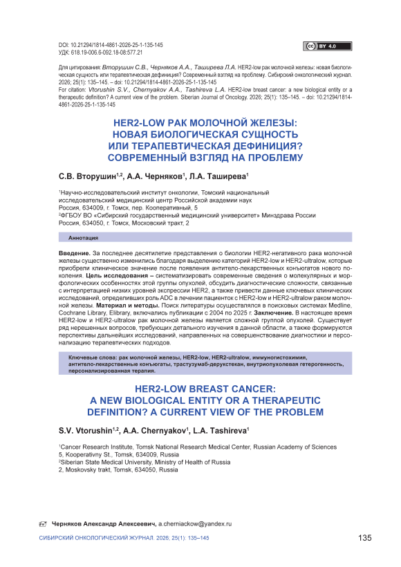 Введение. За последнее десятилетие представления о биологии HER2-негативного рака молочной железы существенно изменились благодаря выделению категорий HER2-low и HER2-ultralow, которые приобрели клиническое значение после появления антитело-лекарственных конъюгатов нового поколения. Цель исследования – систематизировать современные сведения о молекулярных и морфологических особенностях этой группы опухолей, обсудить диагностические сложности, связанные с интерпретацией низких уровней экспрессии HER2, а также привести данные ключевых клинических исследований, определивших роль ADC в лечении пациенток с HER2-low и HER2-ultralow раком молочной железы. Материал и методы. Поиск литературы осуществлялся в поисковых системах Medline, cochrane Library, Elibrary, включались публикации с 2004 по 2025 г. Заключение. В настоящее время HER2-low и HER2-ultralow рак молочной железы является сложной группой опухолей. Существует ряд нерешенных вопросов, требующих детального изучения в данной области, а также формируются перспективы дальнейших исследований, направленных на совершенствование диагностики и персонализацию терапевтических подходов.