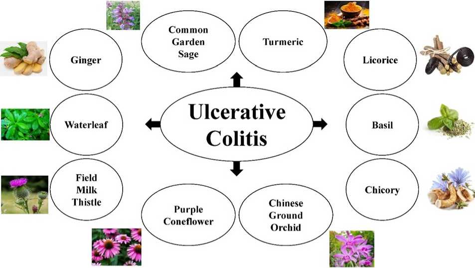 Ulcerative colitis is a chronic inflammatory bowel disease which can influence the rectum and the mucosa of the colon, with sighs usually manifesting as bloody diarrheal and abdominal pain. Natural components have significant potential to treat ulcerative colitis by regulating autophagy with various roles in multiple intestinal cells, with capability of interaction with apoptosis, reticulum stress, gut microbiota, and NLRP3 inflammasome, contributing to ulcerative colitis. The leaf extract of Cassia fistula has high antioxidant and hepatoprotective activity, and contains phenolic acids, chalcones, anthraquinones, flavonoids, and catechins, and its emodin component showed the highest affinity for COX-2 proteins, while isorhamnetin was identified as the appropriate choice for binding associations with the essential amino acids of caspase-3. Purple coneflower ( Echinacea purpurea ) could reduce diarrhea of ulcerative colitis of rats, enhances the intestinal epithelial barrier integrity, and suppressed the level of pro-inflammatory cytokines as well as improved the antioxidant effects (Gu et al ., 2023). One important traditional medicinal herb is Dendrobium huoshanense which is useful for treatment of ulcerative colitis that may target 5 key targets PIK3CA, HSP90AA1, AKT1, STAT3, and SRC, and it could also reduce the levels of TNF-α and IL-6 in the blood, while enhancing the levels of TGF- β and IL-10 (Yao et al ., 2024). Bejeshk et al . (2023) reported that Ocimum basilicum and Acacia arabica can improve ulcerative colitis by reducing oxidative stress and inflammation. Conchus arvensis L., a plant from Chinese folklore, is suggested for treatment of ulcerative colitis (Chang et al ., 2024).