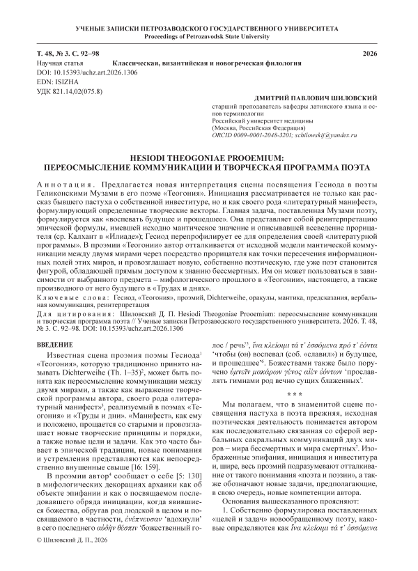 Hesiodi Theogoniae Prooemium: переосмысление коммуникации и творческая программа поэта
