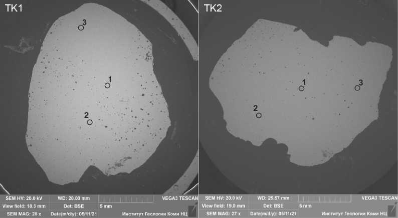 Примечание: Точки микрозондовых анализов 1, 2, 3 показаны на рис. 2. Доверительный интервал ± ∆ — 95 %. Не опр. — не определялось, не обн. — не обнаружено.