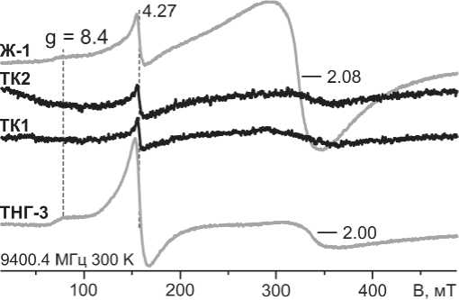 Спектры ЭПР . Спектр ЭПР алюмосиликатного стекла с растворенными ионами трехвалентного железа представлен на рис. 4 образцом тенгизита ТНГ-3, а спектр стекла с наличием кластеров железа — образцом иргизита Ж-1. Образцы тектитов ТК1 и ТК2 (табл. 2) содержат около 5 % оксидов двух- и трехвалентного железа в сумме (Лютоев и др., 2018). Главной особенностью спектра ТНГ-3 является асимметричная интенсивная линия с g-фактором 4.27 шириной по точкам экстремумов ∆Bpp = 14 мТ, сопровождающаяся слабыми особенностями, с g ∼ 8.4 и 2.0. Это типичный спектр ЭПР Х-диапазона силикатного стекла с небольшой примесью ионов Fe3+. Спектр ЭПР иргизита Ж-1 дополнен широкой (∆Bpp = 50 мТ) интенсивной полосой с g = 2.08.