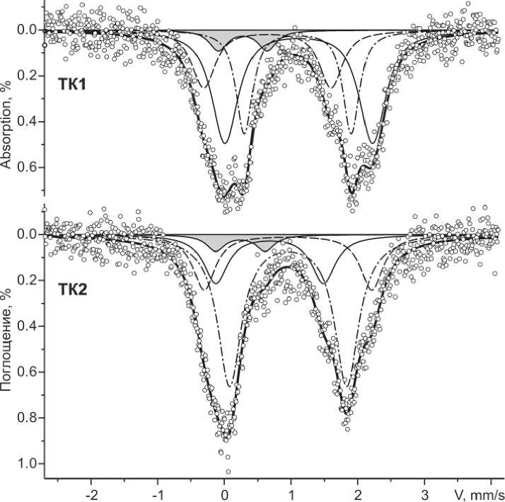 Рис. 5. Мёссбауэровские спектры 57Fe тектитов. Маркеры — экспериментальные значения; жирная сплошная линия — суммарный расчетный спектр; затененный контур — дублет Fe3+; тонкие сплошная и пунктирные линии — дублеты Fe2+ Fig.5. 57Fe Mossbauer spectra of tektites. Markers are experimental values; bold solid line is the calculated spectrum; shaded contour is the Fe3+ doublet; thin solid and dotted are Fe2+ doublets ких пар ионов в изучаемых тектитах указывает наличие малоинтенсивной широкой полосы с g-фактором около 2.0 в спектрах ЭПР, отнесенной к кластерным формам ионов железа (рис. 4). Для прояснения этих вопросов необходимо получение качественных мёс-сбауровских и ЭПР-спектров не только при комнатной температуре, но и при низких, хотя бы азотных температурах.
