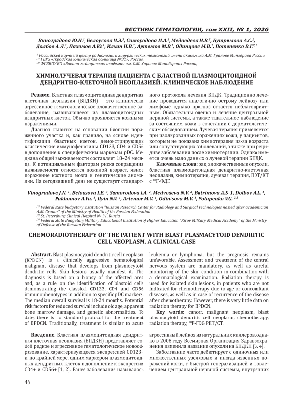 Химиолучевая терапия пациента с бластной плазмоцитоидной дендритноклеточной неоплазией. Клиническое наблюдение
