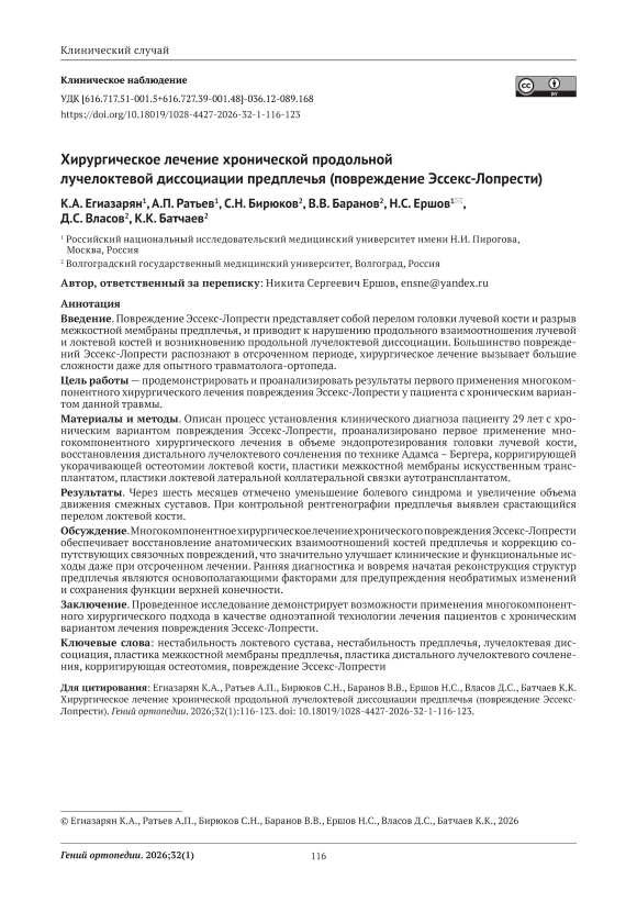 Введение. Повреждение Эссекс-Лопрести представляет собой перелом головки лучевой кости и разрыв межкостной мембраны предплечья, и приводит к нарушению продольного взаимоотношения лучевой и локтевой костей и возникновению продольной лучелоктевой диссоциации. Большинство повреждений Эссекс-Лопрести распознают в отсроченном периоде, хирургическое лечение вызывает большие сложности даже для опытного травматолога-ортопеда. Цель работы — продемонстрировать и проанализировать результаты первого применения многокомпонентного хирургического лечения повреждения Эссекс-Лопрести у пациента с хроническим вариантом данной травмы. Материалы и методы. Описан процесс установления клинического диагноза пациенту 29 лет с хроническим вариантом повреждения Эссекс-Лопрести, проанализировано первое применение многокомпонентного хирургического лечения в объеме эндопротезирования головки лучевой кости, восстановления дистального лучелоктевого сочленения по технике Адамса – Бергера, корригирующей укорачивающей остеотомии локтевой кости, пластики межкостной мембраны искусственным трансплантатом, пластики локтевой латеральной коллатеральной связки аутотрансплантатом. Результаты. Через шесть месяцев отмечено уменьшение болевого синдрома и увеличение объема движения смежных суставов. При контрольной рентгенографии предплечья выявлен срастающийся перелом локтевой кости. Обсуждение. Многокомпонентное хирургическое лечение хронического повреждения Эссекс-Лопрести обеспечивает восстановление анатомических взаимоотношений костей предплечья и коррекцию сопутствующих связочных повреждений, что значительно улучшает клинические и функциональные исходы даже при отсроченном лечении. Ранняя диагностика и вовремя начатая реконструкция структур предплечья являются основополагающими факторами для предупреждения необратимых изменений и сохранения функции верхней конечности. Заключение. Проведенное исследование демонстрирует возможности применения многокомпонентного хирургического подхода в качестве одноэтапной технологии лечения пациентов с хроническим вариантом лечения повреждения Эссекс-Лопрести.