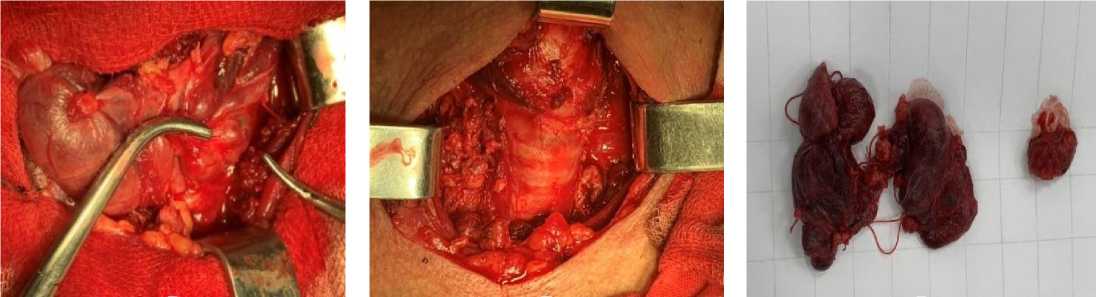 Рисунок 2. Этапы операции у пациентки М., 55 лет. Диагноз: ХБП 5Д ст. ВГПТ. Многоузловой зоб 3 степени по Николаеву, вторичный гиперпаратиреоз: а – вид выделенный ЩЖ и ОЩЖ; б – рана на шее после выполнения тиреоидэктомии и паратиреоидэктомии; в – макропрепарат удалённых ЩЖ и ОЩЖ