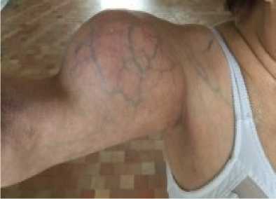 Рисунок 4. Пациентка А., 1947 г. р. Диагноз: ХБП 5Д ст. и ВГПТ, осложнённый уремическим опухолевым кальцинозом, многоузловой зоб III cт.: вид правой верхней конечности до операции Figure 4. Patient A., born 1947. Diagnosis: CKD stage 5D and SHPT complicated by uremic tumoral calcinosis, multinodular goiter grade III: view of the right upper limb before surgery