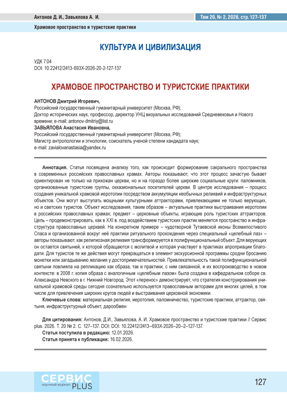 The article is devoted to the analysis of how the sacred space is formed in modern Orthodox churches. The authors show that this process is often focused not only on church parishioners, but also on much broader social circles: pilgrims, organized tour groups, and occasional visitors. The research focuses on the process of creating a unique church hierotopia through the accumulation of unusual relics and infrastructure facilities. They can act as powerful cultural attractions that involve not only believers, but also secular tourists. The object of research, therefore, is the current practices of creating hierotopia (sacred space) in Russian Orthodox churches, specifically the church objects that play the role of tourist attractions. The aim is to demonstrate how the space and infrastructure of Orthodox churches are changing in the 21st century under the influence of tourism practices. Using a specific example – the miraculous Icon of the All–Merciful Savior from the town of Tutaev and the practice of ritual passage through a special “healing manhole” organized around it – the authors show how a religious relic transforms into a multifunctional object. For believers, it remains a shrine to which they turn with prayer and which participates in the practices of the appropriation of grace. For tourists, the same actions can turn into an element of the excursion program, akin to tossing a coin or making a wish at the sights. The attractiveness of such a multifunctional shrine influenced the replication of the image and the practices associated with it, and their reproduction in a new context: in 2008, a copy of the image with a similar “healing hole” was created in the Cathedral of St. Alexander Nevsky in Nizhny Novgorod. This “transfer” demonstrates that the strategy of constructing a unique church environment is now being consciously used by Orthodox actors for many purposes, including to attract a wide range of people and build a church economy.