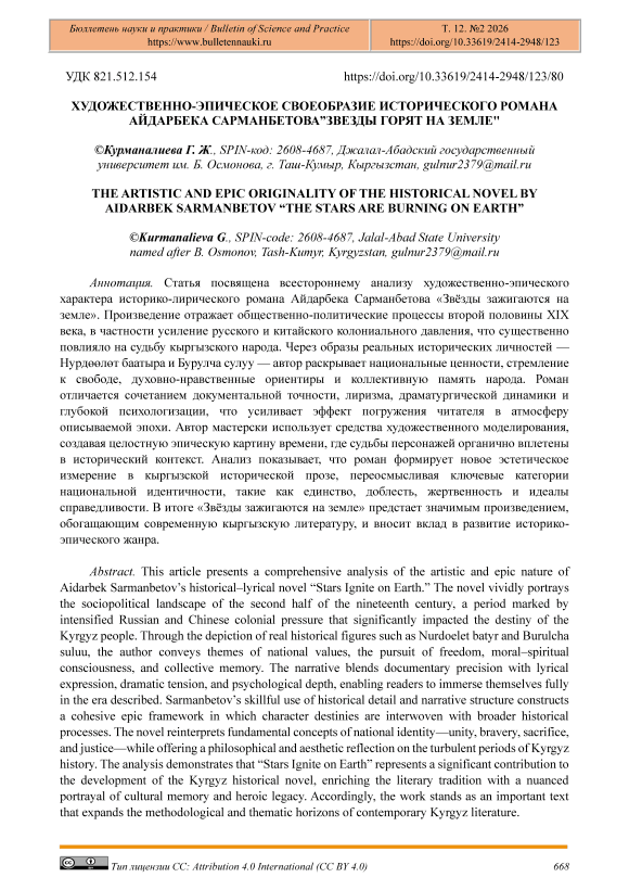 Статья посвящена всестороннему анализу художественно-эпического характера историко-лирического романа Айдарбека Сарманбетова «Звёзды зажигаются на земле». Произведение отражает общественно-политические процессы второй половины XIX века, в частности усиление русского и китайского колониального давления, что существенно повлияло на судьбу кыргызского народа. Через образы реальных исторических личностей — Нурдөөлөт баатыра и Бурулча сулуу — автор раскрывает национальные ценности, стремление к свободе, духовно-нравственные ориентиры и коллективную память народа. Роман отличается сочетанием документальной точности, лиризма, драматургической динамики и глубокой психологизации, что усиливает эффект погружения читателя в атмосферу описываемой эпохи. Автор мастерски использует средства художественного моделирования, создавая целостную эпическую картину времени, где судьбы персонажей органично вплетены в исторический контекст. Анализ показывает, что роман формирует новое эстетическое измерение в кыргызской исторической прозе, переосмысливая ключевые категории национальной идентичности, такие как единство, доблесть, жертвенность и идеалы справедливости. В итоге «Звёзды зажигаются на земле» предстает значимым произведением, обогащающим современную кыргызскую литературу, и вносит вклад в развитие историко-эпического жанра.