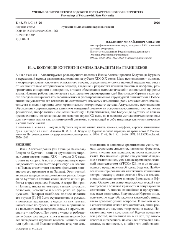 Анализируется роль научного наследия Ивана Александровича Бодуэна де Куртенэ в переходный период развития языкознания на рубеже XIX–XX веков. Цель исследования – выявить и охарактеризовать ключевые аспекты его теории, определившие смену научной парадигмы: отказ от исключительно исторического подхода, введение и разработка понятий фонемы и морфемы, разграничение синхронии и диахронии, а также обоснование психологической и социальной природы языка. Новизна работы заключается в комплексном рассмотрении идей Бодуэна де Куртенэ в контексте преодоления кризиса компаративистики и формирования основ структурной лингвистики. Особое внимание уделяется его взглядам на системность языковых изменений, роль сознательного вмешательства в язык и критику догм сравнительно-исторического метода. Актуальность исследования обусловлена сохраняющимся влиянием концепций ученого на современную лингвистику, включая фонологию, морфологию и социолингвистику. Подчеркивается, что Бодуэн де Куртенэ не только предвосхитил многие направления развития науки XX века, но и заложил методологические основы для изучения языка как динамической системы, сочетающей в себе индивидуально-психическое и социальное начала.