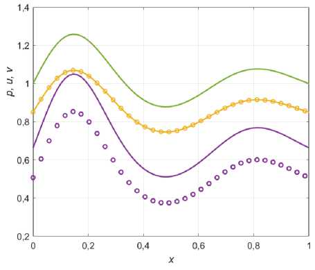 Рис. 1. Распределения ресурса (зеленый), жертвы (желтый) и хищника (фиолетовый). Сплошные линии решение (1.4), кружочки - решение (3.5) при a = 0,2 . Коэффициенты систем: Ц; = 5,2;^ = 1;ц2 = 2Д2 = 1,7 .