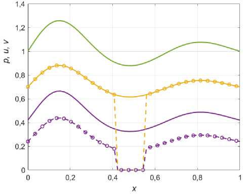 Видно, что возмущение начальных условий приводит к затухающим колебаниям по краям ареала, в то время как в его центре зарождается осциллирующий режим, вызванный изменением функции ресурса по координате, в минимуме p ( x ) нарушается условие (3.6).