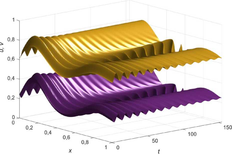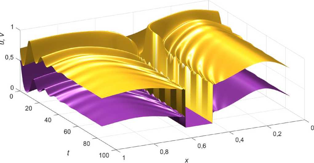 Значения коэффициентов: a = 0; ^ = ц2 = 2; Z = 1,2; Z2 = 0,9; u 0( x ) = e • u ( x ); v 0( x ) = e • v ( x ); e = 1,3 .