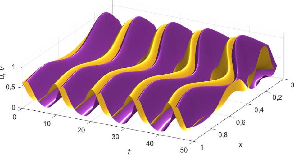 Значения коэффициентов а = 0,3; ц = ц2 = 2; \ = 1; Z2 = 1,4; u 0 ( x ) = е • u ( x ); v 0 ( x ) = e • v ( x ); e = 0,92 .