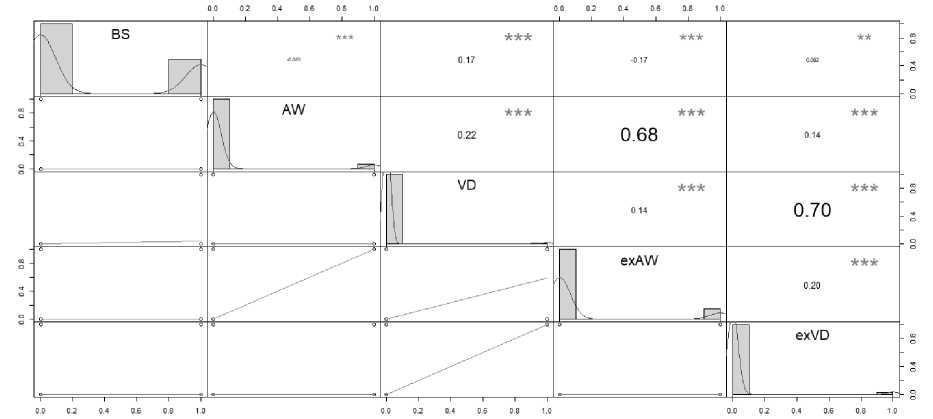 Статистический анализ. Для интерпретации полученных данных были рассмотрены зависимости между полученными переменными. Переменным были присвоены названия: BS (подвид пчелы A. m. carnica и A. m. mellifera ), AW (визуальное обнаружение клеща A. woodi ), VD (визуальное обнаружение клеща V. destructor ), exAW (обнаружение клеща A. woodi в экзогенной ДНК), и exVD (обнаружение клеща V. destructor в экзогенной ДНК). Корреляционный анализ проводили с использованием теста Пирсона, линейная регрессия проводилась с использованием статистического программного обеспечения для MS Excel.