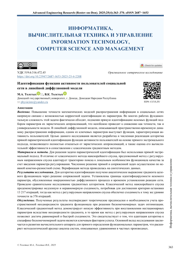Введение. Повышение точности математических моделей распространения информации в социальных сетях напрямую связано с возможностью корректной идентификации их параметров. Во многих работах фундаментальную сложность этой задачи фактически обходят, подменяя прямую идентификацию искомых функций подбором параметров их эвристических аппроксимаций, что неизбежно приводит к снижению как точности, так и универсальности модели. В линейной диффузионной модели, описывающей пространственно-временную динамику распространения информации, одним из ключевых параметров выступает функция, характеризующая активность пользователей. Целью данного исследования является разработка и численная реализация алгоритма прямой параметрической идентификации функции активности пользователей на основе прямого экстремального подхода, позволяющего полностью отказаться от эвристических аппроксимаций, а также оценка его вычислительной эффективности в сопоставлении с классическим градиентным методом. Материалы и методы. Для решения задачи параметрической идентификации был использован прямой экстремальный подход. В отличие от классического метода наискорейшего спуска, предложенный метод с регулируемым направлением спуска адаптирует траекторию поиска к локальным особенностям функционала качества за счет введения параметра регулирования. Численное решение прямой и сопряженной задач осуществлено по неявной конечно-разностной схеме. Верификация метода проводилась на синтетических данных. Результаты исследования. Для алгоритма идентификации получено аналитическое выражение градиента целевого функционала через решение сопряженной задачи. Установлены границы идентифицируемости искомого параметра, обусловленные инерционностью диффузионного процесса и временем установления реакции сети. Проведено сравнительное исследование градиентных алгоритмов. Классический метод наискорейшего спуска продемонстрировал медленную и неравномерную сходимость, потребовав для достижения критерия остановки 13 217 итераций, тогда как метод с регулируемым направлением спуска обеспечил сходимость к тому же уровню точности за 376 итераций. Обсуждение. Полученные результаты подтверждают теоретические предпосылки о необходимости учета пространственной неоднородности градиента функционала при решении бесконечномерных задач оптимизации. Классический градиентный метод демонстрирует низкую эффективность при восстановлении нестационарных параметров вследствие неоднородности градиента, в то время как метод с регулируемым направлением спуска позволяет достичь равномерной и быстрой сходимости. Это свидетельствует о том, что адаптация алгоритма к специфике бесконечномерной задачи является ключевым фактором успеха. Основной вклад исследования заключается в развитии вычислительного аппарата для прямого определения функциональных параметров, что расширяет методологический арсенал анализа систем, описываемых уравнениями в частных производных. Заключение. Основными результатами работы являются разработка и верификация эффективного алгоритма прямой идентификации функции активности пользователей в линейной диффузионной модели социальной сети. Практическая значимость состоит в создании более точных и интерпретируемых инструментов 