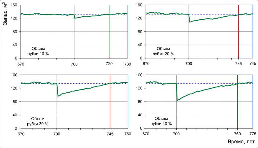 При проведении вычислительных экспериментов рассматривали интенсивность изъятия в размере 10%, 20%, 30% и 40% от общего запаса древесины, что согласуется с рекомендациями к проведению добровольно-выборочных рубок. Согласно этим рекомендациям, интенсивность рубки составляет 15–20% через 8–15 лет, 21–30% через 15–30 лет, 40% с периодичностью 25–40 лет в зависимости от состояния насаждения и хода возобновления [3]. Результаты моделирования показали, что при такой интенсивности изъятия запас древостоя восстанавливается до прежнего состояния через 20, 35, 45 и 60 лет соответственно (рис. 1, красная линия).