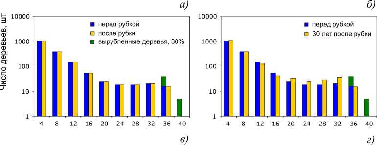Рассмотрим модельный сценарий процесса восстановления структуры древостоя при интенсивности изъятия 30% от общего запаса древесины. Изначально в процессе восстановления древостоя увеличивается число деревьев среднего диаметра от 20 до 32 см, что связано с улучшением условий освещения. При этом отсутствуют деревья последней ступени толщины (рис. 2б). В случае, когда запас древесины достигает первоначального значения (через 45 лет после рубки), структура древостоя не соответствует первоначальному состоянию, наблюдается незначительное число деревьев последней ступени толщины (рис. 2в). Восстановление структуры древостоя