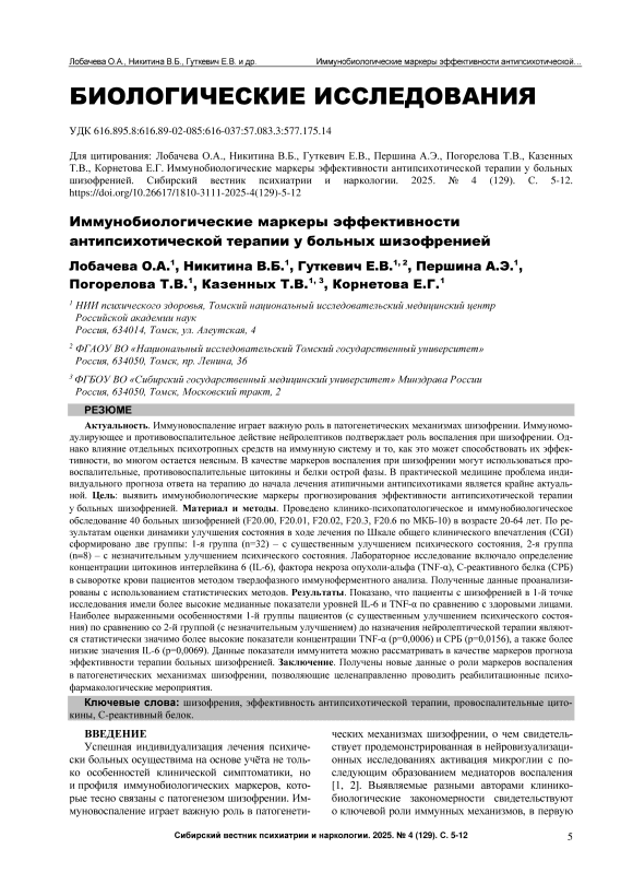 Актуальность.Иммуновоспаление играет важную роль в патогенетических механизмах шизофрении. Иммуномодулирующее и противовоспалительное действие нейролептиков подтверждает роль воспаления при шизофрении. Однако влияние отдельных психотропных средств на иммунную систему и то, как это может способствовать их эффективности, во многом остается неясным. В качестве маркеров воспаления при шизофрении могут использоваться провоспалительные, противовоспалительные цитокины и белки острой фазы. В практической медицине проблема индивидуального прогноза ответа на терапию до начала лечения атипичными антипсихотиками является крайне актуальной. Цель: выявить иммунобиологические маркеры прогнозирования эффективности антипсихотической терапии у больных шизофренией. Материал и методы. Проведено клинико-психопатологическое и иммунобиологическое обследование 40 больных шизофренией (F20.00, F20.01, F20.02, F20.3, F20.6 по МКБ-10) в возрасте 20-64 лет. По результатам оценки динамики улучшения состояния в ходе лечения по Шкале общего клинического впечатления (CGI) сформировано две группы: 1-я группа (n=32) – с существенным улучшением психического состояния, 2-я группа (n=8) – с незначительным улучшением психического состояния. Лабораторное исследование включало определение концентрации цитокинов интерлейкина 6 (IL-6), фактора некроза опухоли-альфа (TNF-α), С-реактивного белка (СРБ) в сыворотке крови пациентов методом твердофазного иммуноферментного анализа. Полученные данные проанализированы с использованием статистических методов. Результаты. Показано, что пациенты с шизофренией в 1-й точке исследования имели более высокие медианные показатели уровней IL-6 и TNF-α по сравнению с здоровыми лицами. Наиболее выраженными особенностями 1-й группы пациентов (с существенным улучшением психического состояния) по сравнению со 2-й группой (с незначительным улучшением) до назначения нейролептической терапии являются статистически значимо более высокие показатели концентрации TNF-α (p=0,0006) и СРБ (p=0,0156), а также более низкие значения IL-6 (p=0,0069). Данные показатели иммунитета можно рассматривать в качестве маркеров прогноза эффективности терапии больных шизофренией. Заключение. Получены новые данные о роли маркеров воспаления в патогенетических механизмах шизофрении, позволяющие целенаправленно проводить реабилитационные психофармакологические мероприятия.