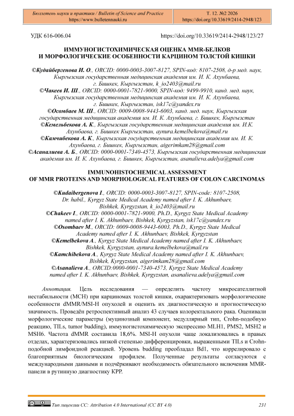 В настоящем исследовании показано, что доля dMMR/MSI-H-опухолей в выборке пациентов Кыргызской республики составила 18,6%, что сопоставимо с данными крупнейших популяционных серий, где частота МСН-H КРР варьирует от 10% до 15%. Полученные морфологические характеристики dMMR-опухолей — преобладание правосторонней локализации, медуллярного и/или муцинозного строения, выраженных TILs и Crohn-подобной лимфоидной реакции — согласуются с классическим фенотипом MSI-H карцином толстой кишки, описанным в ряде работ.