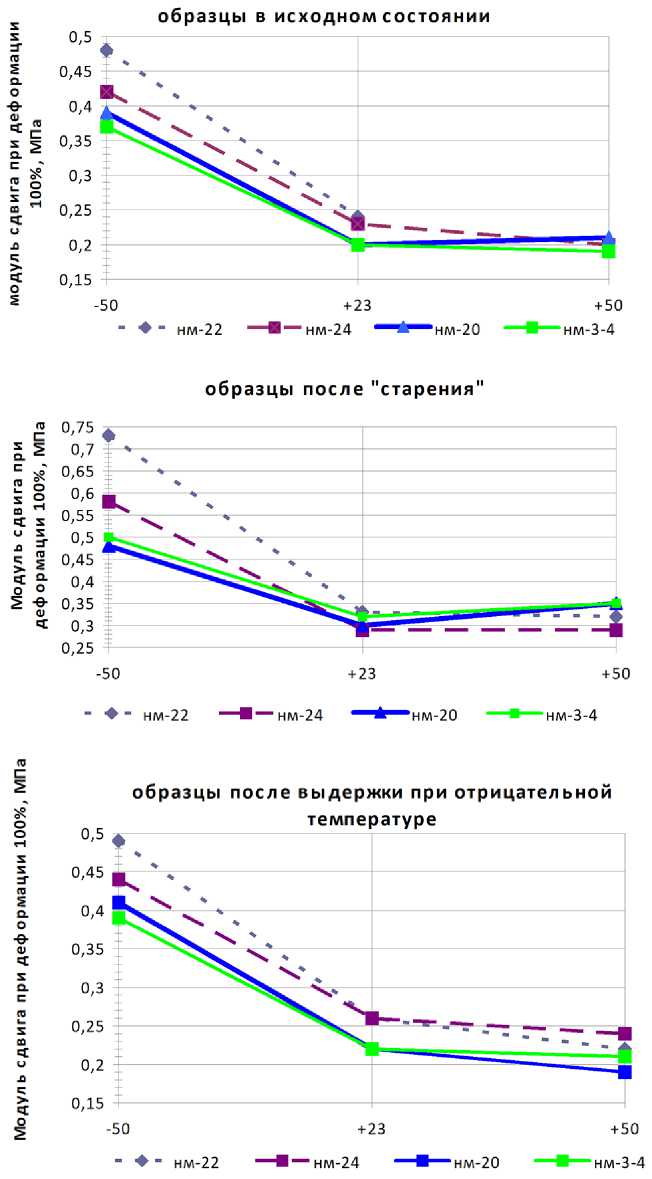 Анализ результатов исследований опытных низкомодульных морозостойких композиций в диапазоне температур от –50 до +50 °C показал, что приемлемым вариантом для проведения дальнейших работ является резиновая смесь марки НМ-20. Наряду с наименьшим значением модуля упругости при сдвиге резиновая смесь НМ-20 превосходит все представленные образцы матери- алов по адгезионным характеристикам при сдвиге и при отрыве.