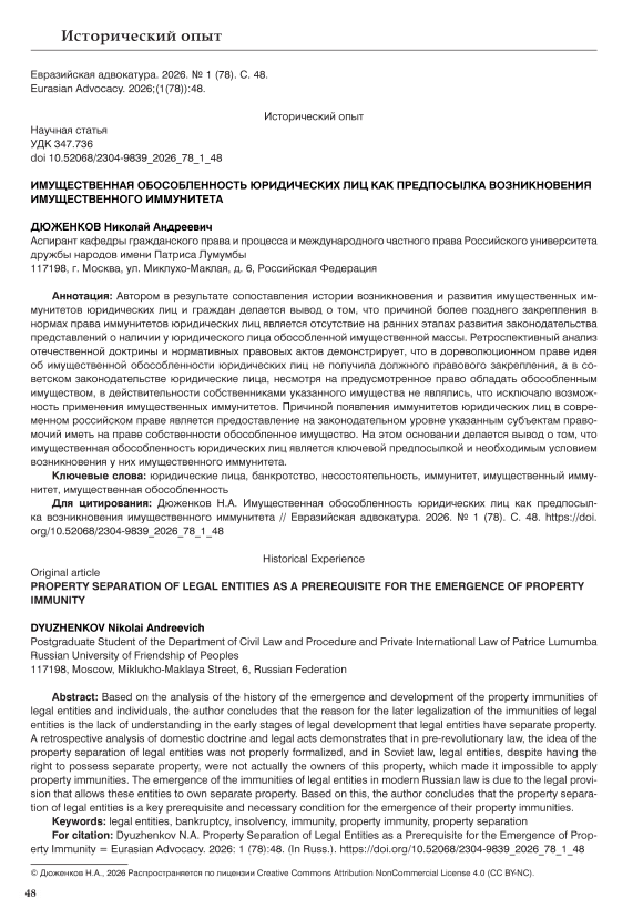 Автором в результате сопоставления истории возникновения и развития имущественных иммунитетов юридических лиц и граждан делается вывод о том, что причиной более позднего закрепления в нормах права иммунитетов юридических лиц является отсутствие на ранних этапах развития законодательства представлений о наличии у юридического лица обособленной имущественной массы. Ретроспективный анализ отечественной доктрины и нормативных правовых актов демонстрирует, что в дореволюционном праве идея об имущественной обособленности юридических лиц не получила должного правового закрепления, а в советском законодательстве юридические лица, несмотря на предусмотренное право обладать обособленным имуществом, в действительности собственниками указанного имущества не являлись, что исключало возможность применения имущественных иммунитетов. Причиной появления иммунитетов юридических лиц в современном российском праве является предоставление на законодательном уровне указанным субъектам правомочий иметь на праве собственности обособленное имущество. На этом основании делается вывод о том, что имущественная обособленность юридических лиц является ключевой предпосылкой и необходимым условием возникновения у них имущественного иммунитета.