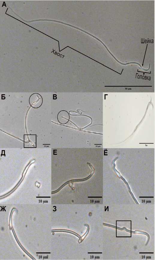 Рис. 1. Примеры дефектов сперматозоидов крыс. A – нормальный сперматозоид, Б – головка без хвоста и большой угол наклона головки, В – хвост без головки, Г – сперматозоид с двумя головками и дополнительными дефектами, Д – уплощенная головка, Е – булавочная головка, Ё – деформация головки, Ж – изогнутый угол наклона головки, З – патология шейки, И – изогнутый хвост. Без окрашивания, ув. х 400