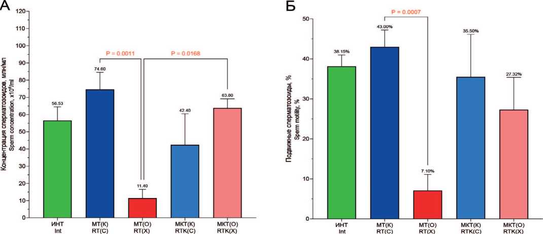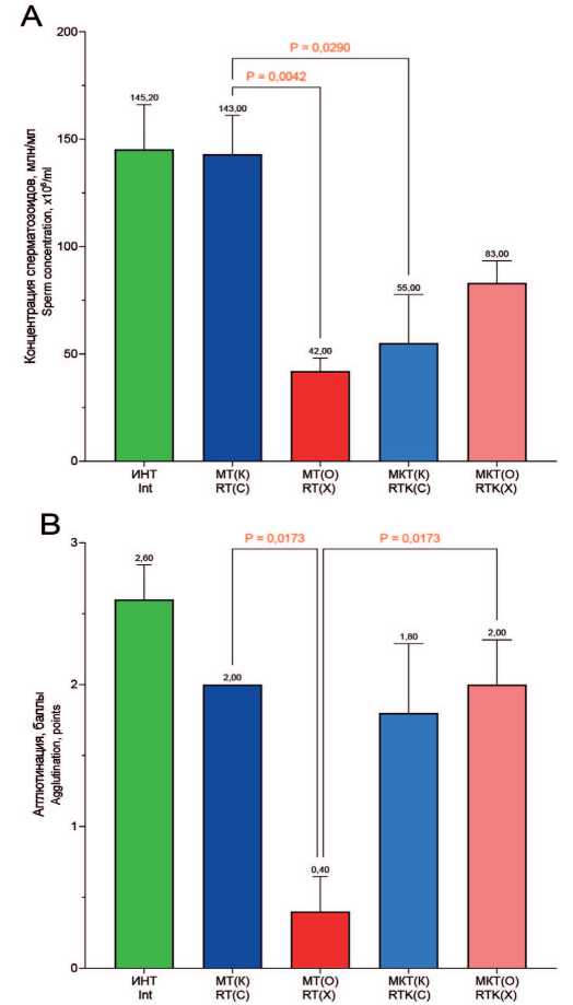 Статистические методы. Все полученные данные были обработаны в программе GraphPad Prism 9.5.1. Показатели нативного эякулята и эпидидимисов при сравнении 2экспериментальных групп проанализированы с помощью непараметрического критерия Манна-Уитни, при сравнении 3 и более групп использовали непараметрический тест для независимых переменных Краскела-Уоллеса, а для точного определения отличий между каждой независимой группой проводили тест Данна для попарных сравнений с последующей коррекцией с помощью двухэтапного пошагового метода Бенджамини,Кригера и Екутиэли. Морфометрические параметры сперматозоидов при сравнении 2 экспериментальных групп анализировали с помощью параметрического t-критерия Уэлча, при сравнении 3 и более групп использовали однофакторный дисперсионный анализ (O ne-W ay ANOVA), для определения отличий между группами применяли апостериорный критерий Геймсу-Хоуэллу. Показатели нативного эякулята крыс до и после воздействия температуры сравнивали с помощью двухфакторного дисперсионного анализа Фридмана по рангам,а для попарных сравнений выборок применили критерий Вилкоксона для связанных повторных наблюдений. Различия считали значимыми при p<0,05. Данные в таблицах представлены, как М ± SE.