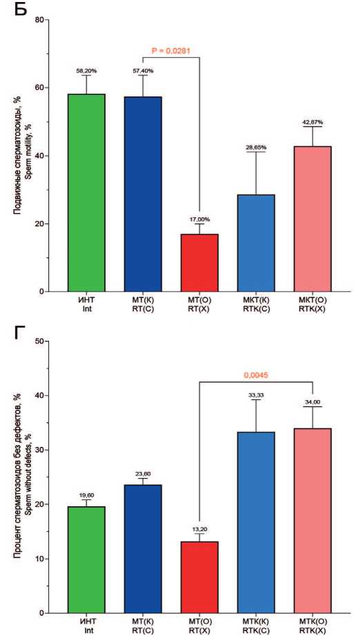 сперматозоидов, их агглютинации, количества лецитиновых зерен. Процент подвижных сперматозоидов достоверно не изменяется, но отмечается положительная тенденция на его сохранение (рис. 4Б).