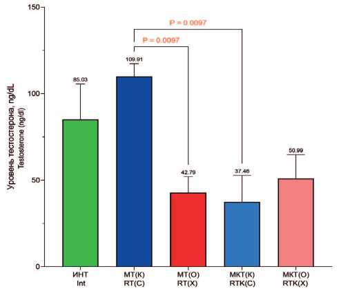 Fig. 3. Total testosterone concentration in rat blood serum, ng/dl. Note: differences are significant according to the Kruskal-Wallis test, followed by Dunn post-hoc test, with correction using the Benjamini, Krieger and Yekutieli method ( p <0,05)