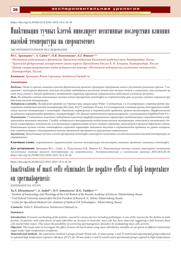 Введение. Одной из причин снижения мужской фертильности является чрезмерное перегревание яичек в результате различных причин. У пациентов с некоторыми формами мужского бесплодия наблюдается увеличение количества тучных клеток в семенниках, что указывает на связь этих клеток с данной проблемой и возможность коррекции нарушений сперматогенеза модуляцией состояния последних. Цель. Исследовать влияние инактивации тучных клеток препаратом кетотифен на сперматозоиды крыс на разных стадиях созревания при действии высокой температуры. Материалы и методы. Эксперимент проведен на 5 группах крыс самцов линии Wistar: 1) интактная, 2 и 3) контрольная и опытная группы многократного воздействия высокой температуры (48 суток, 43±1°C ежедневно 30 мин), 4 и 5) контрольная и опытная группы многократного воздействия высокой температуры + кетотифен. Оценивали спермограмму и сперматозоиды придатка, уровень тестостерона. Морфологические исследования сперматозоидов проводили с помощью ImageJ 1.53t. Данные статистически проанализированы с использованием GraphPad Prism 9.5.1. Результаты. У интактных животных наблюдаются различия морфофункциональных параметров эпидидимальных сперматозоидов и сперматозоидов нативного эякулята. У особей, подвергшихся многократному воздействию высокой температуры, отмечается значительное снижение концентрации, подвижности и агглютинации сперматозоидов на всех стадиях созревания, увеличивается процент дефектных клеток. Инактивация тучных клеток кетотифеном сохраняет параметры нативного эякулята и сперматозоидов придатка на уровне контроля, что свидетельствует о благоприятном влиянии применение препарата на нарушенный сперматогенез. Заключение. Инактивация тучных клеток препаратом кетотифен нивелирует негативные последствия влияния высокой температуры на сперматогенез.