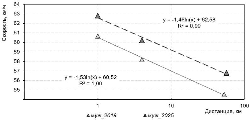 Рис. 1. Зависимость рекордных значений скорости передвижения от длины дистанции у мужчин в индивидуальных гонках трекового велоспорта на 1 км, 4 км и в часовой гонке в 2019 и 2025 гг. (в логарифмической шкале абсцисс)