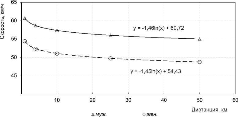 Визуализация полученных формул представлена на графиках снижения предельной скорости элитными велогонщиками и велогонщицами по мере увеличения длины дистанции (рис. 2). Любая точка графика расчётных моделей, отражающая пару значений «длина дистанции – скорость», соответствует одному и тому же значению CRP, равному 1000 пунктам.