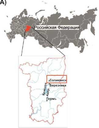 Исследования свидетельствуют о том, что засоление пресных вод не ограничено только полузасушливыми и средиземноморскими регионами, а также наблюдается в холодных и умеренных регионах (Can˜edo-ArguЁelles et al., 2019; Jeppesen et al., 2023). В континентальной части на значительном удалении от морского побережья отмечается поступление высокого содержания хлорид-ионов, обусловленное неглубоким залеганием соляных пластов и естественной родниковой разгрузкой высокоминерализованных вод , в результате чего с XV в. зародился соляной промысел на территории Верхнекамья (Ушакова, Меньшикова, 2024). После открытия Верхнекамского месторождения солей в 1925 г. и организации на его территории горно-химического производства было зафиксировано поступление высоких концентраций хлорид-ионов ( Cl– ) и катионов натрия ( Na +) как от точечных, так и от диффузных источников загрязнения, к которым относятся: поверхностный сток с промышленных территорий и зон транспортной инфраструктуры, естественная разгрузка высокоминерализованных подземных вод, фильтрационные разгрузки из действующих и законсервированных шламохранилищ и накопителей жидких и твердых отходов, а также поступление рассолов из рассолоподъемных скважин XVI–XIX вв. (Щербинина и др., 2023; Белкин, 2020; Ушакова и др., 2022). В результате природных и техногенных факторов на территории Верхнекамья развиты процессы галогенеза, которые нетипичны для таежных ландшафтов (Хайрулина, 2022).