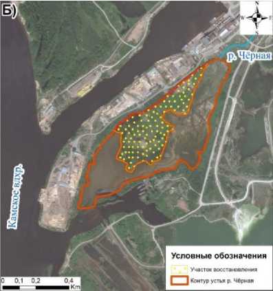 В качестве модельного объекта исследования рассмотрено устье старого русла р. Чёрная, находящееся в зоне выклинивания подпора Камского водохранилища (г. Соликамск, Пермский край) (рис. 1). С 2017 года в устьевую часть р. Чёрной прекращено поступление сбросов сточных вод химических предприятий в связи с реализацией природоохранных мероприятий по отводу сточных вод на механические очистные сооружения. Ранее на протяжении 70 лет осуществлялся активный сброс неочищенных сточных вод до 90-х гг. XX в. с минерализацией до 200 г/л, где сформирована толща тонкодисперсных техногенно-аллювиальных отложений с высоким содержанием Sr, Ni, Co, Mn, Mo, Se, V, Li и с щелочной средой, хлорид-но-натриевым и калиевым составом водной вытяжки, которые перекрыты небольшим терригенным слоем (Ушакова, 2024). Площадь старого русла составляет 33,4 га (из них 21,4 га – техногенный осадок, 12,0 га – естественное восстановление участка старого русла).