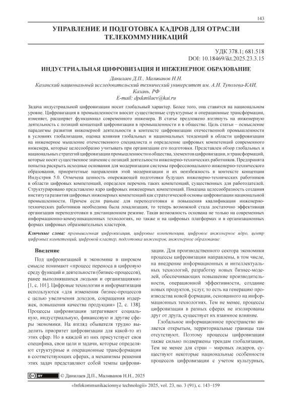 Промышленная цифровизация, цифровые компетенции, цифровое инженерное ядро, центр цифровых компетенций, цифровой кластер, подготовка инженеров, инженерное образование