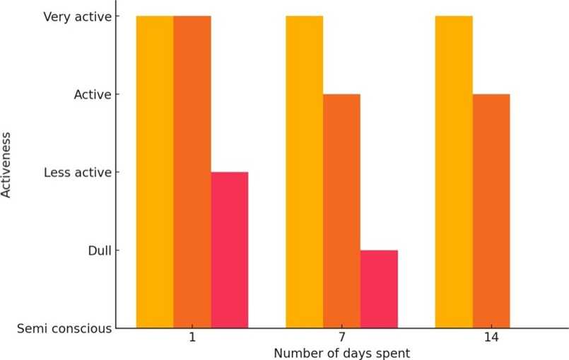 Figure 1. Graphical Representation of the Activeness of Normal, Control and Experimental Gerbil during Experiment